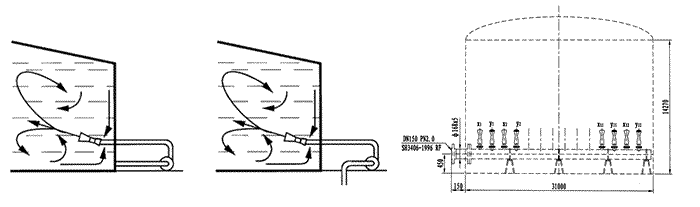 PSG系列罐用喷射式混合器,在大型贮存罐中的作用尤为显著,其安装方位如图所示。