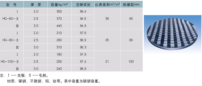 HG-F型蜂窝格栅填料支承再分布器,是该填料的组成部分,采有和波纹板式结构,盘高100mm左右,共两层,90°交错而成,其主要作用对液滴均匀地破碎切割,提高传质效率。