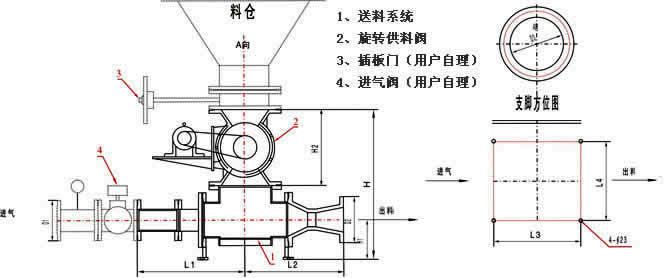 PSG系列气固喷射器,以离心风机(空压机、罗茨风机)为动力气源,运用气固两相流原理,以流态化技术,射流技术和压差原理相结合,以电动旋转供料器为供料装置,将物料送入料气混合室,物料在料气混合室流态化的同时,利用双环状喷嘴产生的高速气流将物料送入加速室,以悬浮流进入输送管道,利用气力压差将物料沿管道送入受料仓内。料气分离,经布袋除尘器过滤后将气体排入大气。